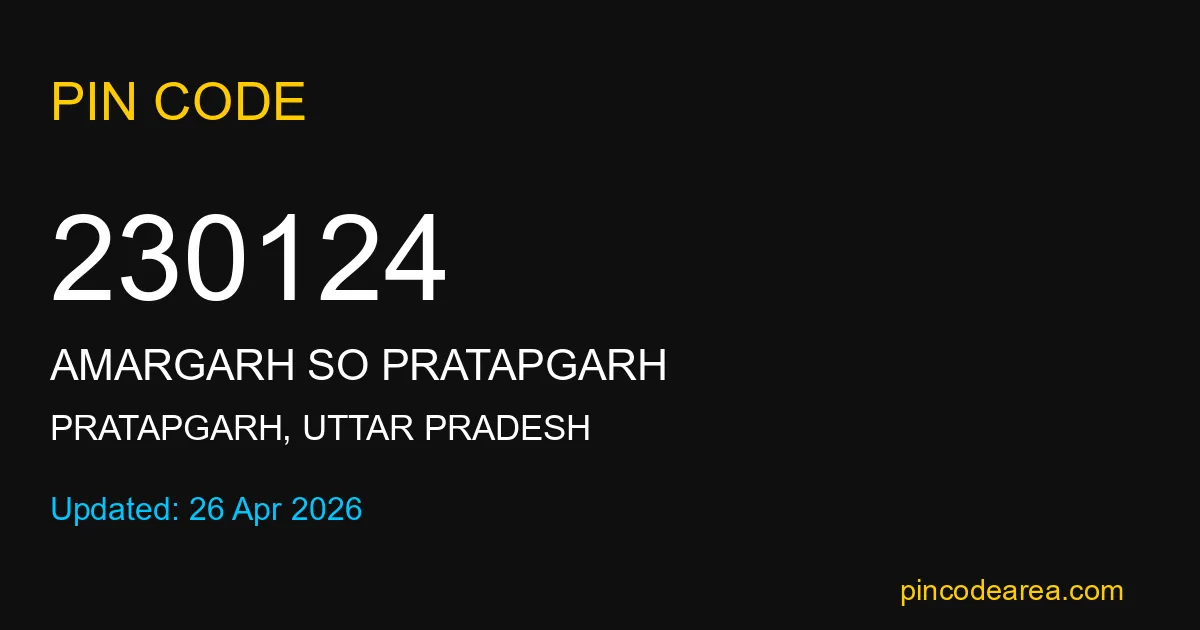 230124 PIN Code belongs to Amargarh SO Pratapgarh Post Office in Pratapgarh district of Uttar Pradesh, India. This area mainly includes local residential and rural regions where India Post ensures timely mail and parcel delivery services.
