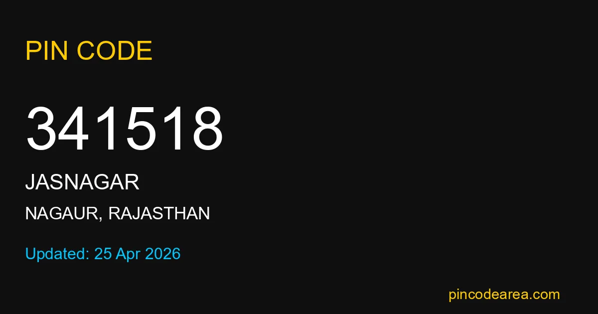 341518 PIN Code belongs to Jasnagar Post Office in Nagaur district of Rajasthan, India. This area mainly includes local residential and rural regions where India Post ensures timely mail and parcel delivery services.