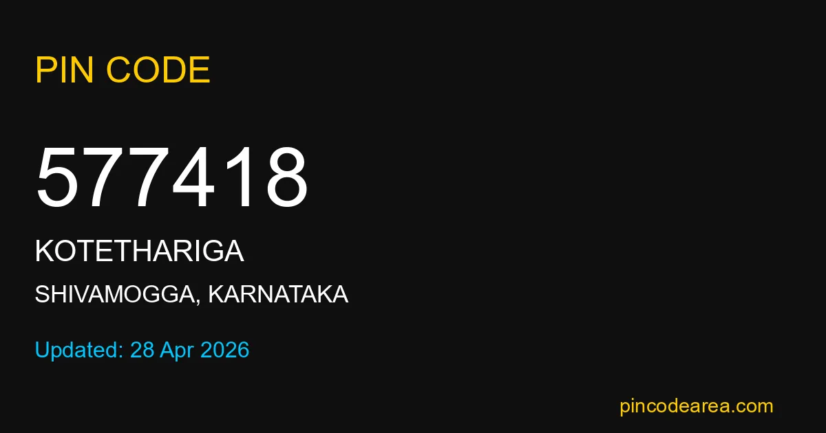577418 PIN Code is assigned to Kotethariga Post Office located in Shivamogga district of Karnataka. It helps identify the exact delivery area for postal and courier services.