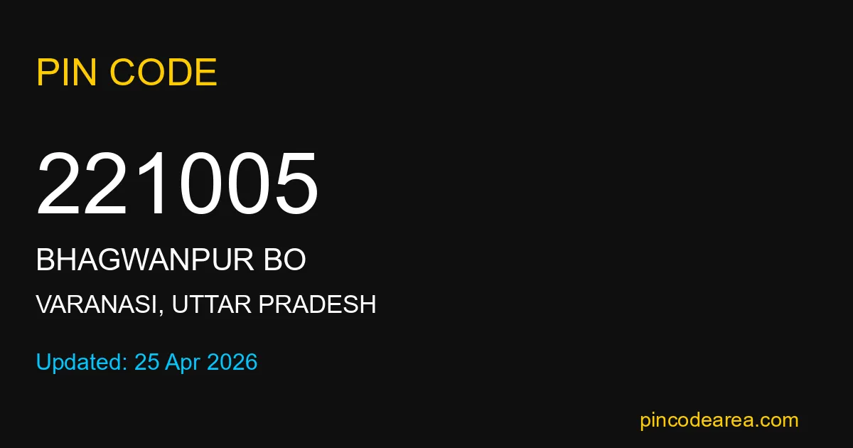 221005 PIN Code belongs to Bhagwanpur BO Post Office in Varanasi district of Uttar Pradesh, India. This area mainly includes local residential and rural regions where India Post ensures timely mail and parcel delivery services.