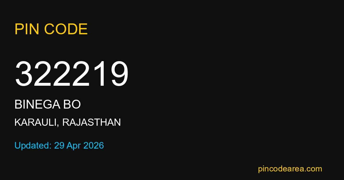 If you are searching for accurate location details, 322219 helps identify the exact postal region of Binega BO in Rajasthan.