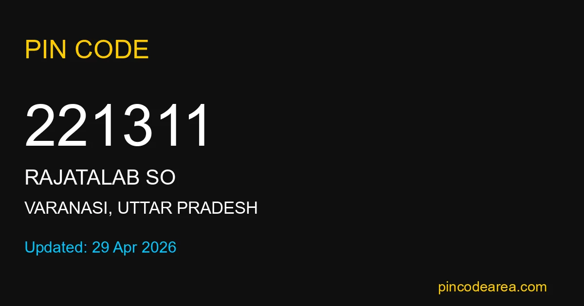 221311 PIN Code is assigned to Rajatalab SO Post Office located in Varanasi district of Uttar Pradesh. It helps identify the exact delivery area for postal and courier services.