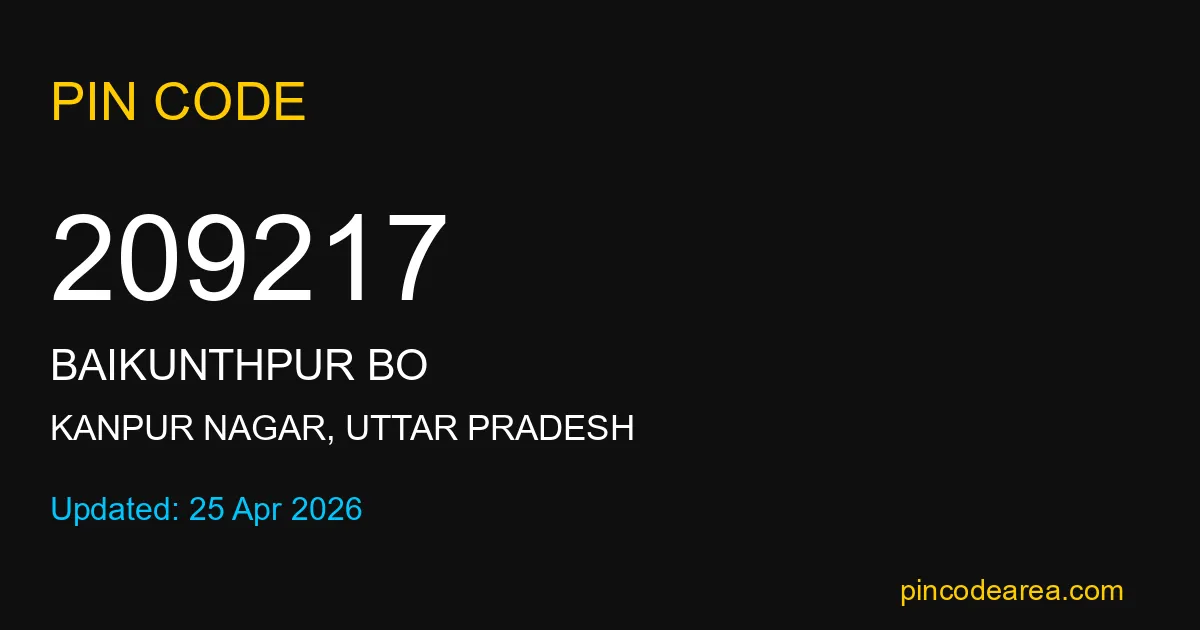 209217 PIN Code is assigned to Baikunthpur BO Post Office located in Kanpur Nagar district of Uttar Pradesh. It helps in identifying the exact delivery area.