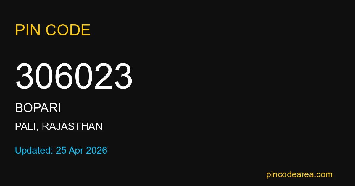 306023 PIN Code is assigned to Bopari Post Office located in Pali district of Rajasthan. It helps in identifying the exact delivery area.