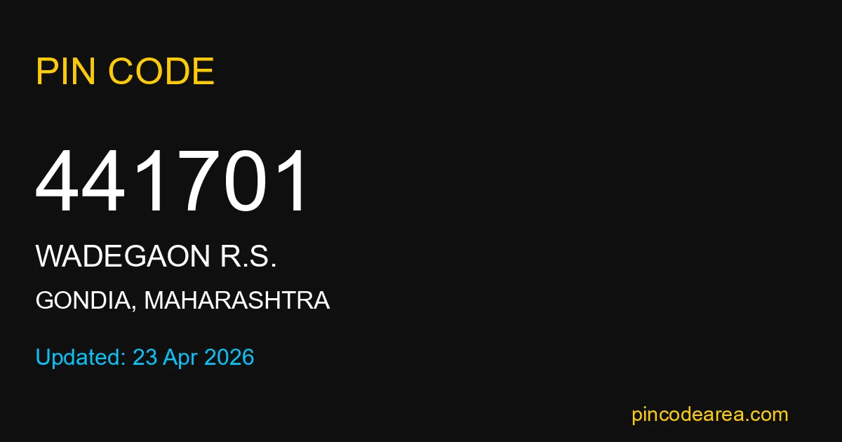 441701 PIN Code is assigned to Wadegaon R.S. Post Office located in Gondia district of Maharashtra. It helps in identifying the exact delivery area.