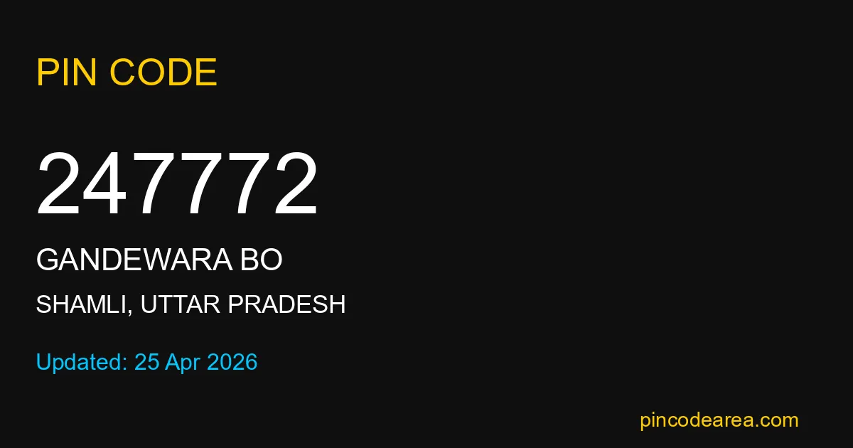 247772 PIN Code belongs to Gandewara BO Post Office in Shamli district of Uttar Pradesh, India. This area mainly includes local residential and rural regions where India Post ensures timely mail and parcel delivery services.