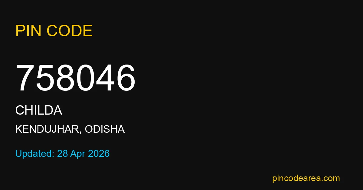 758046 PIN Code is assigned to Childa Post Office located in Kendujhar district of Odisha. It helps identify the exact delivery area for postal and courier services.