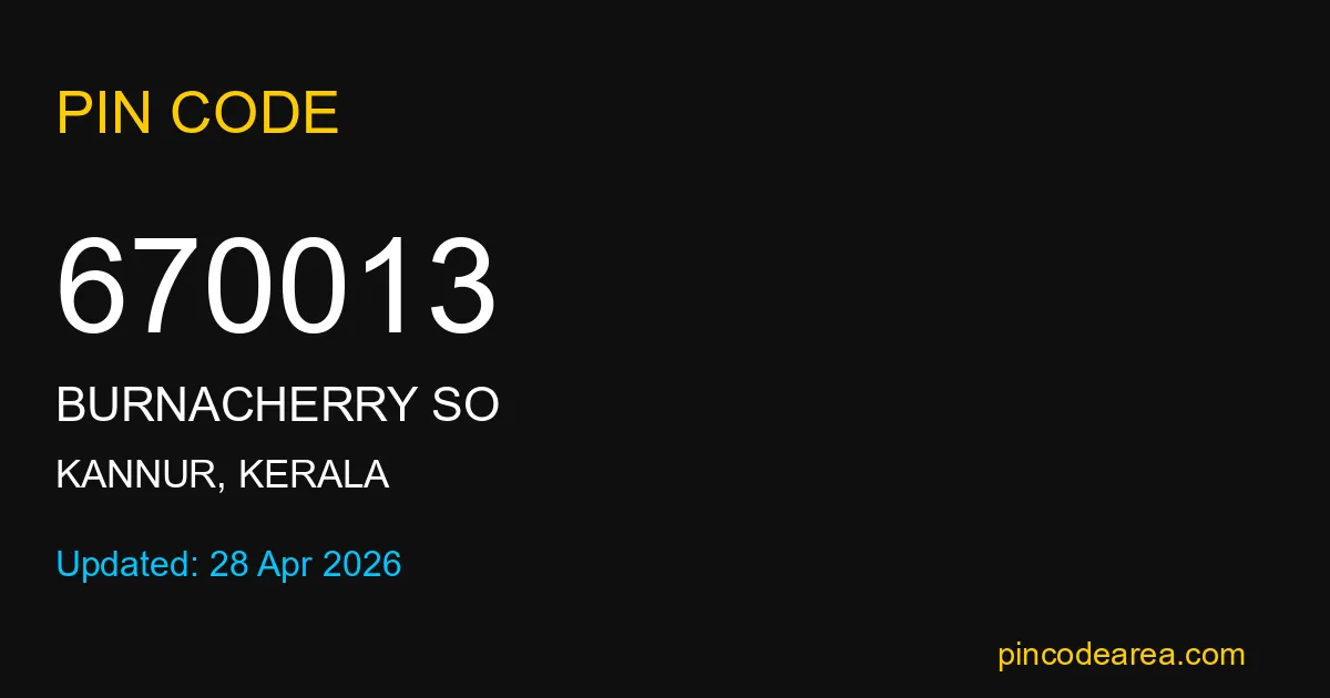670013 PIN Code is assigned to Burnacherry SO Post Office located in Kannur district of Kerala. It helps identify the exact delivery area for postal and courier services.