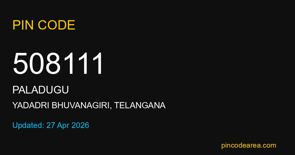 508111 PIN Code is assigned to Paladugu Post Office located in Yadadri Bhuvanagiri district of Telangana. It helps identify the exact delivery area for postal and courier services.