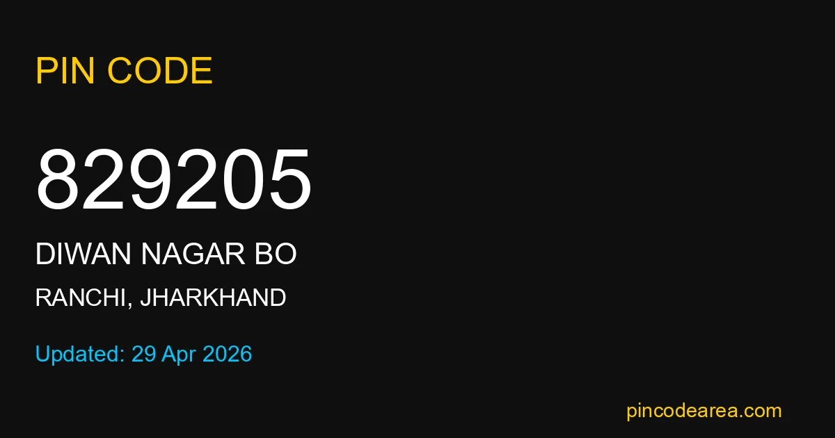829205 PIN Code is assigned to Diwan Nagar BO Post Office located in Ranchi district of Jharkhand. It helps identify the exact delivery area for postal and courier services.