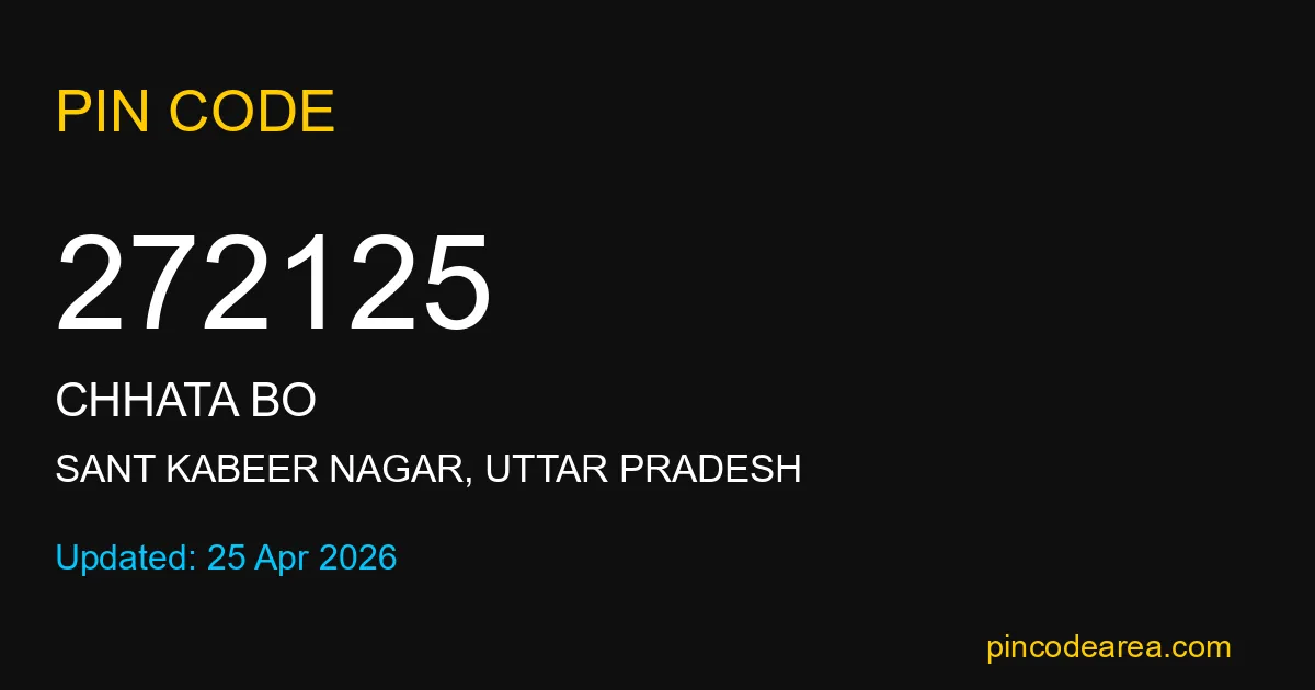 272125 PIN Code is assigned to Chhata BO Post Office located in Sant Kabeer Nagar district of Uttar Pradesh. It helps in identifying the exact delivery area.