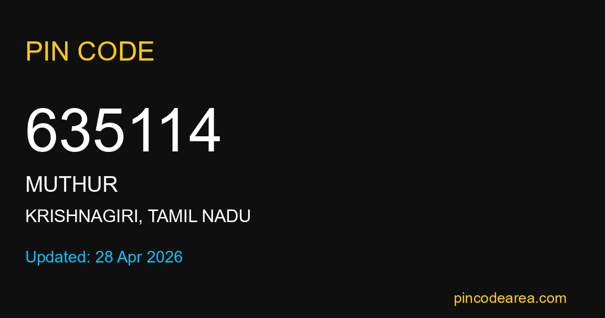 635114 PIN Code is assigned to Muthur Post Office located in Krishnagiri district of Tamil Nadu. It helps identify the exact delivery area for postal and courier services.