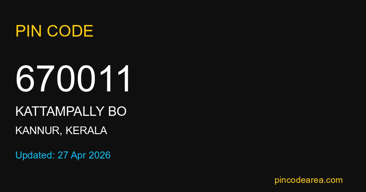 670011 PIN Code is assigned to Kattampally BO Post Office located in Kannur district of Kerala. It helps identify the exact delivery area for postal and courier services.