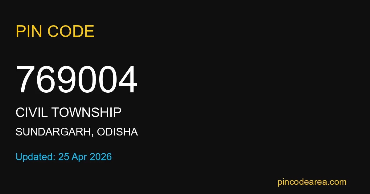 769004 PIN Code is assigned to Civil Township Post Office located in Sundargarh district of Odisha. It helps in identifying the exact delivery area.