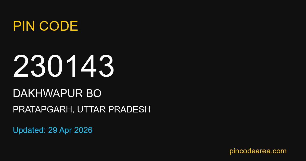 230143 PIN Code is assigned to Dakhwapur BO Post Office located in Pratapgarh district of Uttar Pradesh. It helps identify the exact delivery area for postal and courier services.