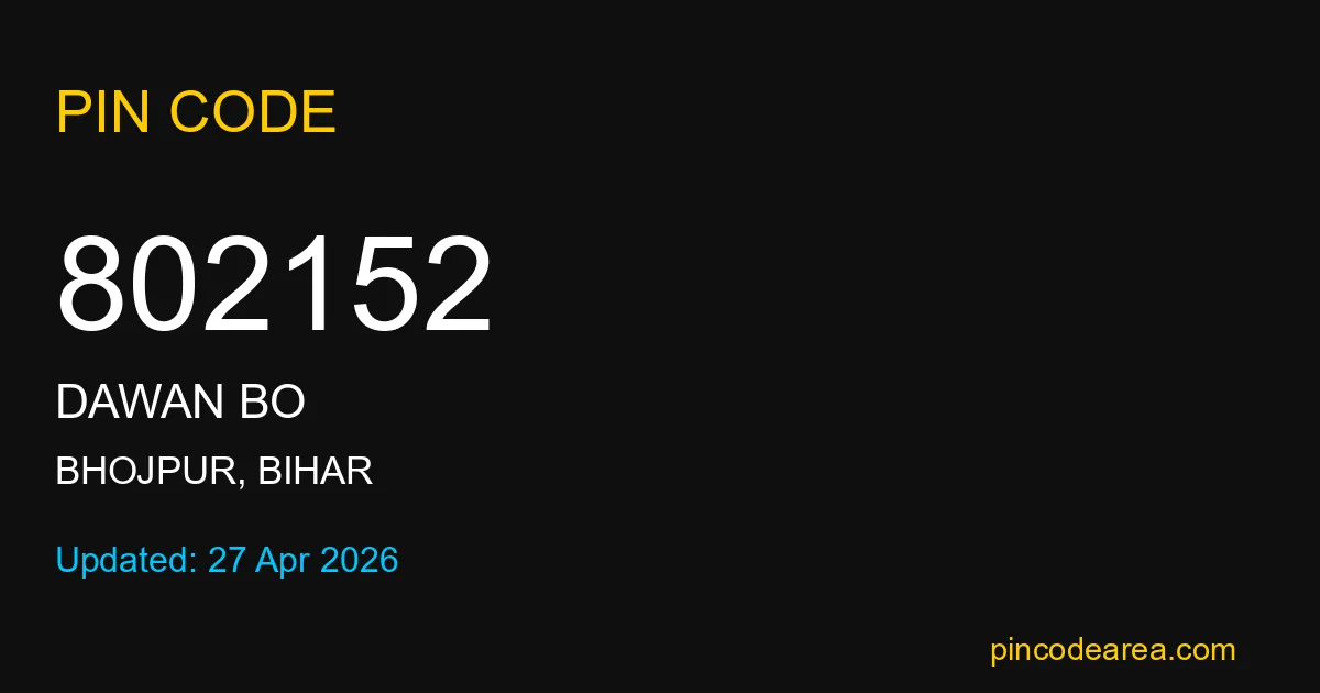 802152 PIN Code is assigned to Dawan BO Post Office located in Bhojpur district of Bihar. It helps identify the exact delivery area for postal and courier services.