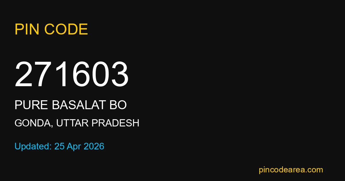 271603 PIN Code is assigned to Pure Basalat BO Post Office located in Gonda district of Uttar Pradesh. It helps in identifying the exact delivery area.