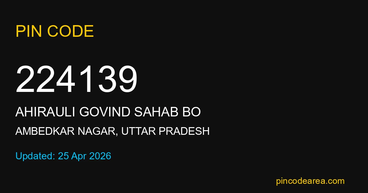 224139 PIN Code is assigned to Ahirauli Govind Sahab BO Post Office located in Ambedkar Nagar district of Uttar Pradesh. It helps in identifying the exact delivery area.
