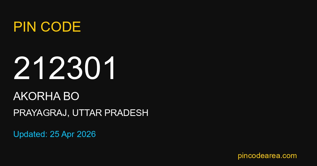212301 PIN Code is assigned to Akorha BO Post Office located in Prayagraj district of Uttar Pradesh. It helps in identifying the exact delivery area.