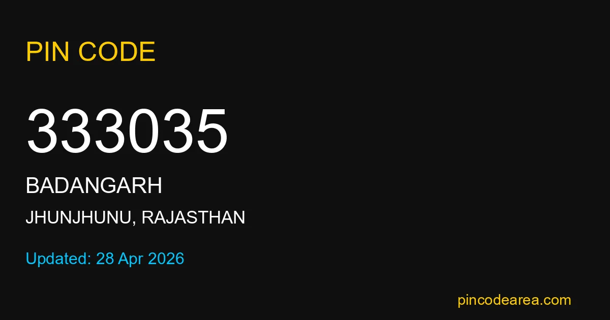 333035 PIN Code is assigned to Badangarh Post Office located in Jhunjhunu district of Rajasthan. It helps identify the exact delivery area for postal and courier services.