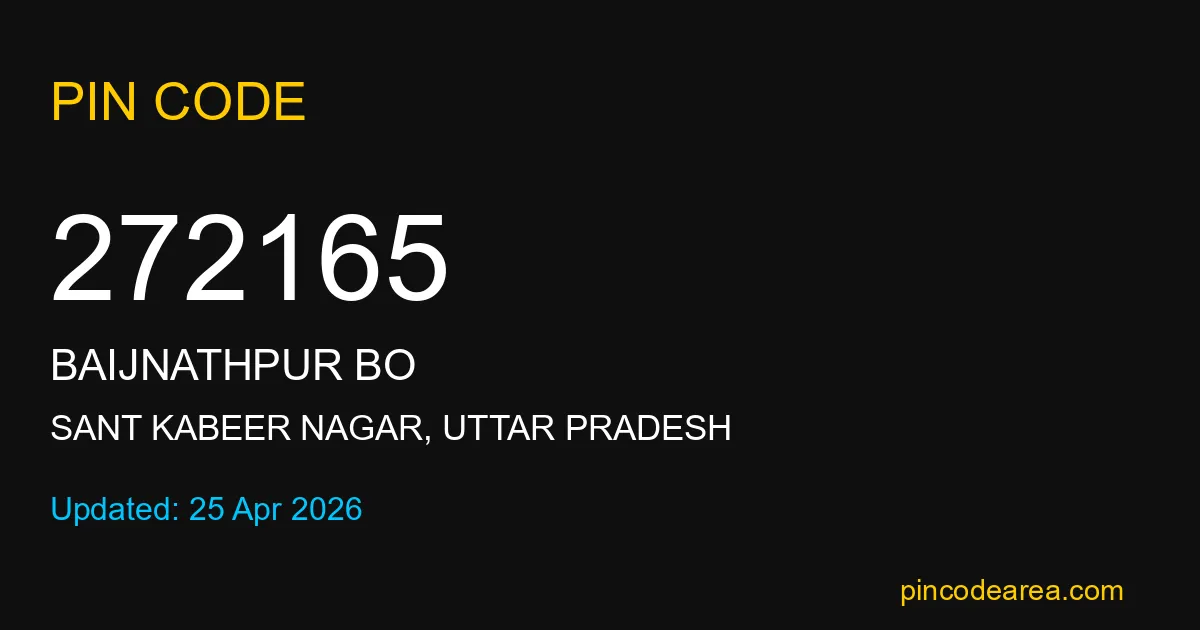 272165 PIN Code belongs to Baijnathpur BO Post Office in Sant Kabeer Nagar district of Uttar Pradesh, India. This area mainly includes local residential and rural regions where India Post ensures timely mail and parcel delivery services.