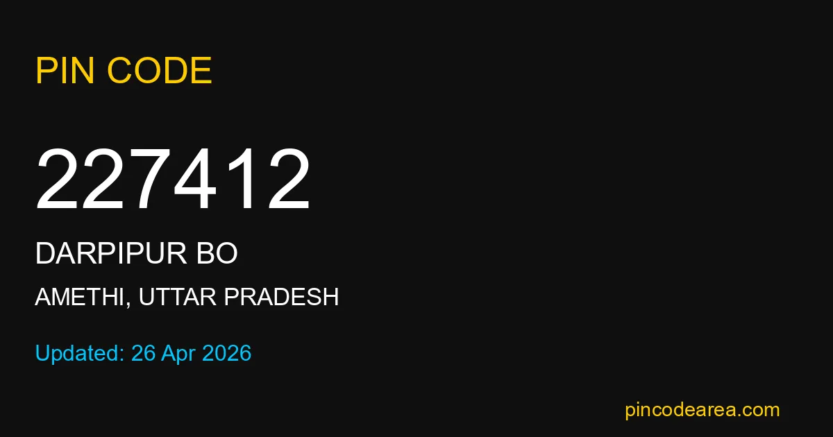 227412 PIN Code is assigned to Darpipur BO Post Office located in Amethi district of Uttar Pradesh. It helps identify the exact delivery area for postal and courier services.