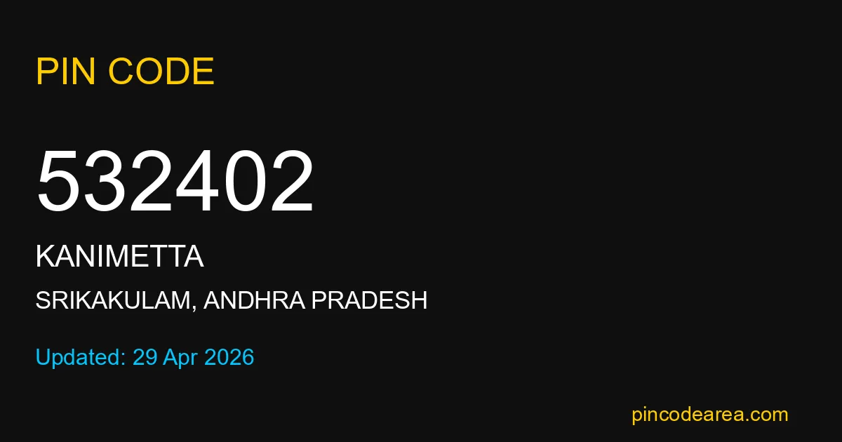 532402 PIN Code is assigned to Kanimetta Post Office located in Srikakulam district of Andhra Pradesh. It helps identify the exact delivery area for postal and courier services.