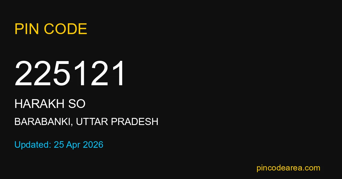 225121 PIN Code is assigned to Harakh SO Post Office located in Barabanki district of Uttar Pradesh. It helps in identifying the exact delivery area.