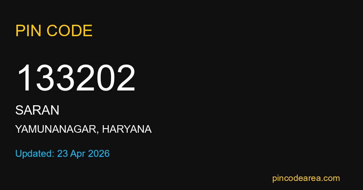 133202 PIN Code is assigned to Saran Post Office located in Yamunanagar district of Haryana. It helps in identifying the exact delivery area.