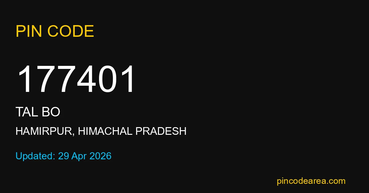177401 PIN Code is assigned to Tal BO Post Office located in Hamirpur district of Himachal Pradesh. It helps identify the exact delivery area for postal and courier services.