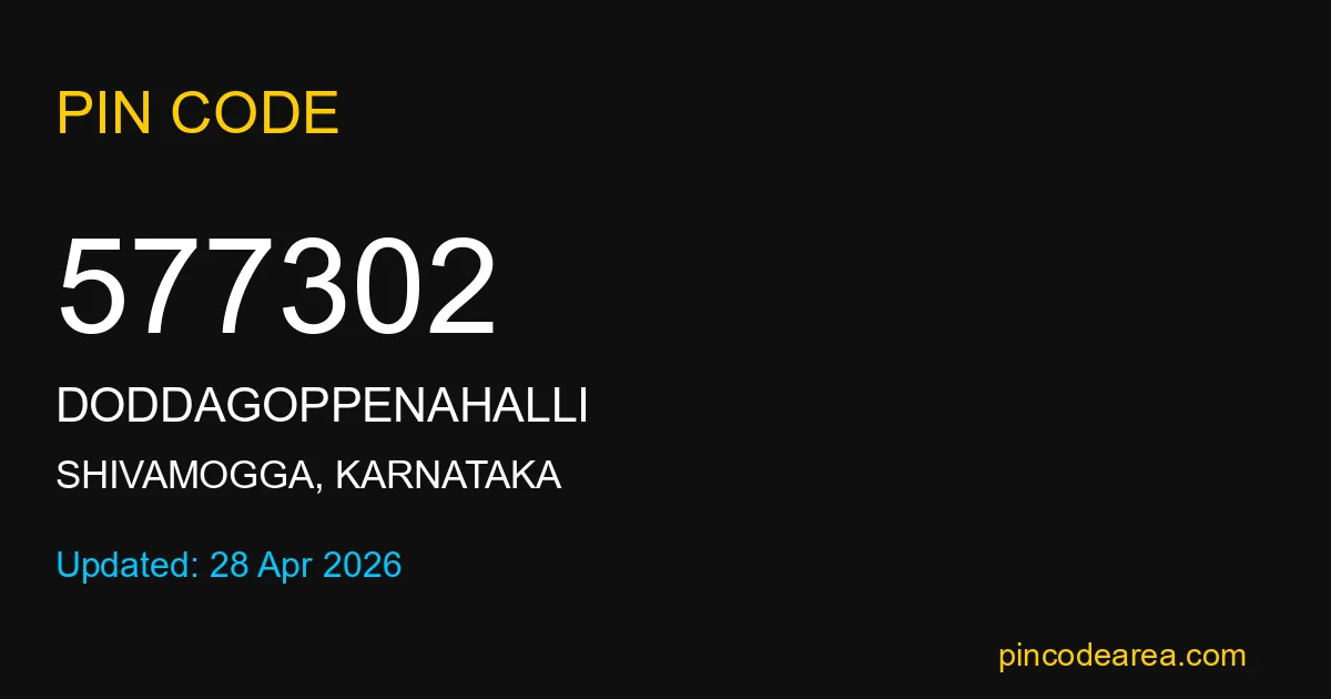 577302 PIN Code is assigned to Doddagoppenahalli Post Office located in Shivamogga district of Karnataka. It helps identify the exact delivery area for postal and courier services.