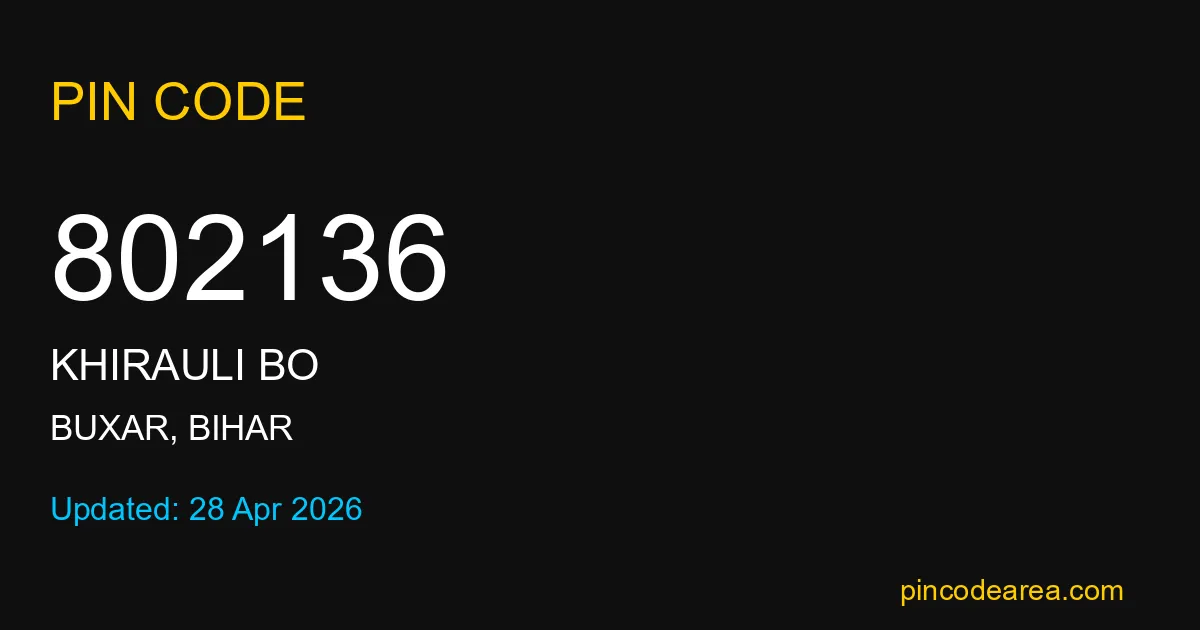 802136 PIN Code is assigned to Khirauli BO Post Office located in Buxar district of Bihar. It helps identify the exact delivery area for postal and courier services.