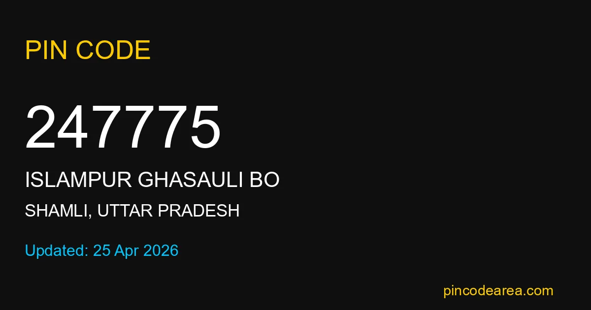 247775 PIN Code is assigned to Islampur Ghasauli BO Post Office located in Shamli district of Uttar Pradesh. It helps in identifying the exact delivery area.