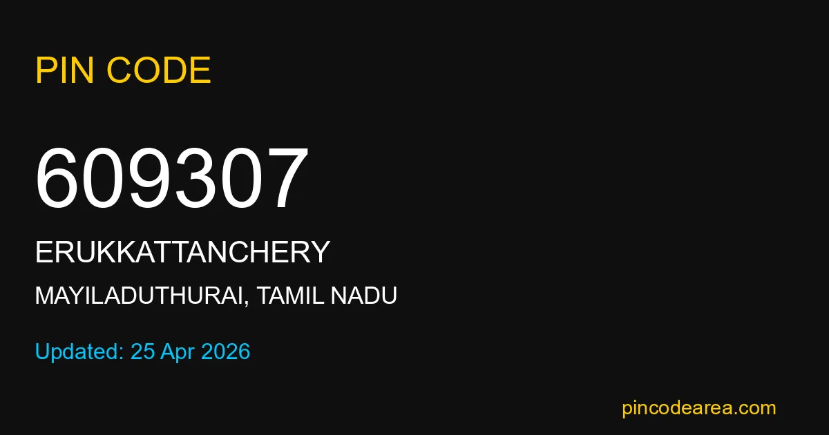 609307 PIN Code is assigned to Erukkattanchery Post Office located in Mayiladuthurai district of Tamil Nadu. It helps in identifying the exact delivery area.