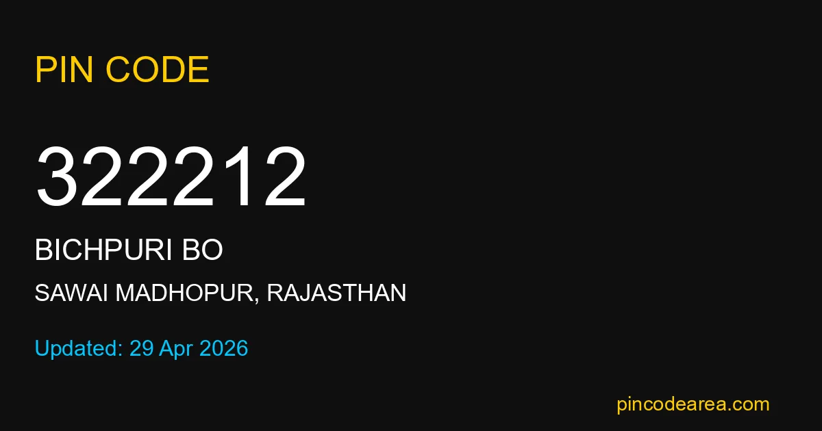 322212 PIN Code is assigned to Bichpuri BO Post Office located in Sawai Madhopur district of Rajasthan. It helps identify the exact delivery area for postal and courier services.