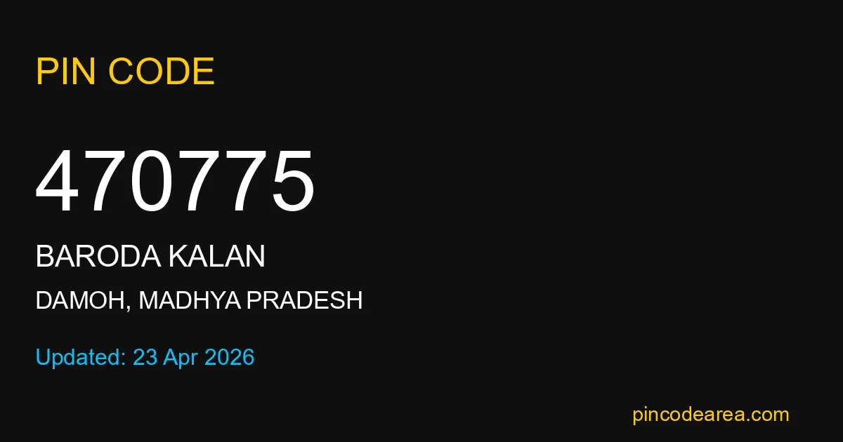 470775 PIN Code is assigned to Baroda Kalan Post Office located in Damoh district of Madhya Pradesh. It helps in identifying the exact delivery area.