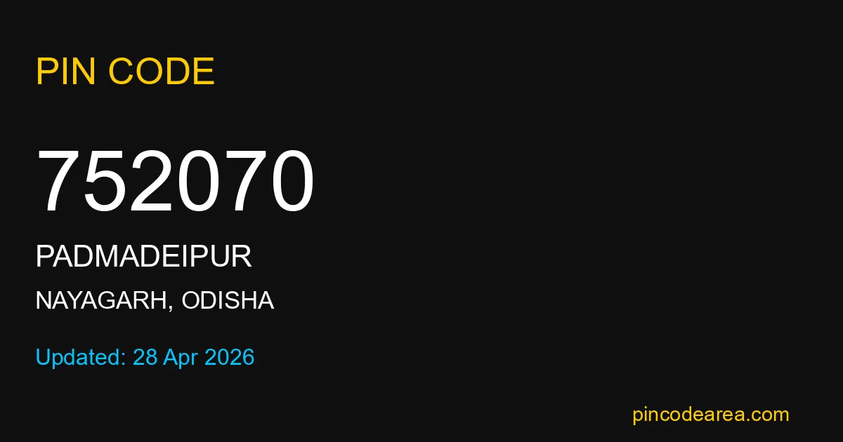 752070 PIN Code is assigned to Padmadeipur Post Office located in Nayagarh district of Odisha. It helps identify the exact delivery area for postal and courier services.