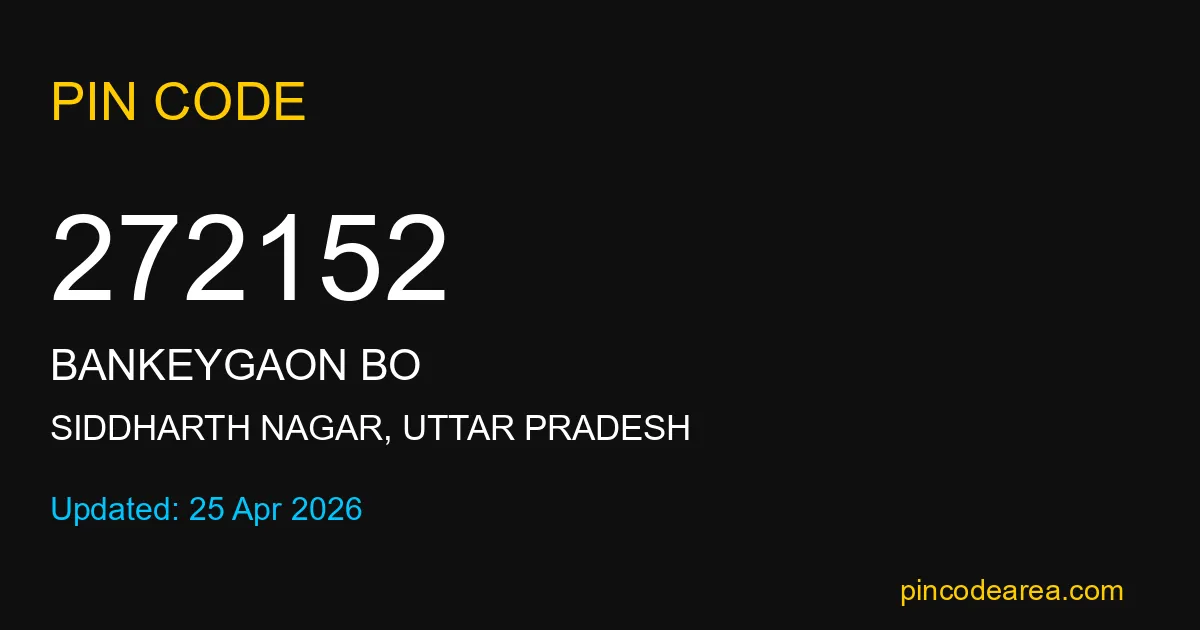 272152 PIN Code belongs to Bankeygaon BO Post Office in Siddharth Nagar district of Uttar Pradesh, India. This area mainly includes local residential and rural regions where India Post ensures timely mail and parcel delivery services.