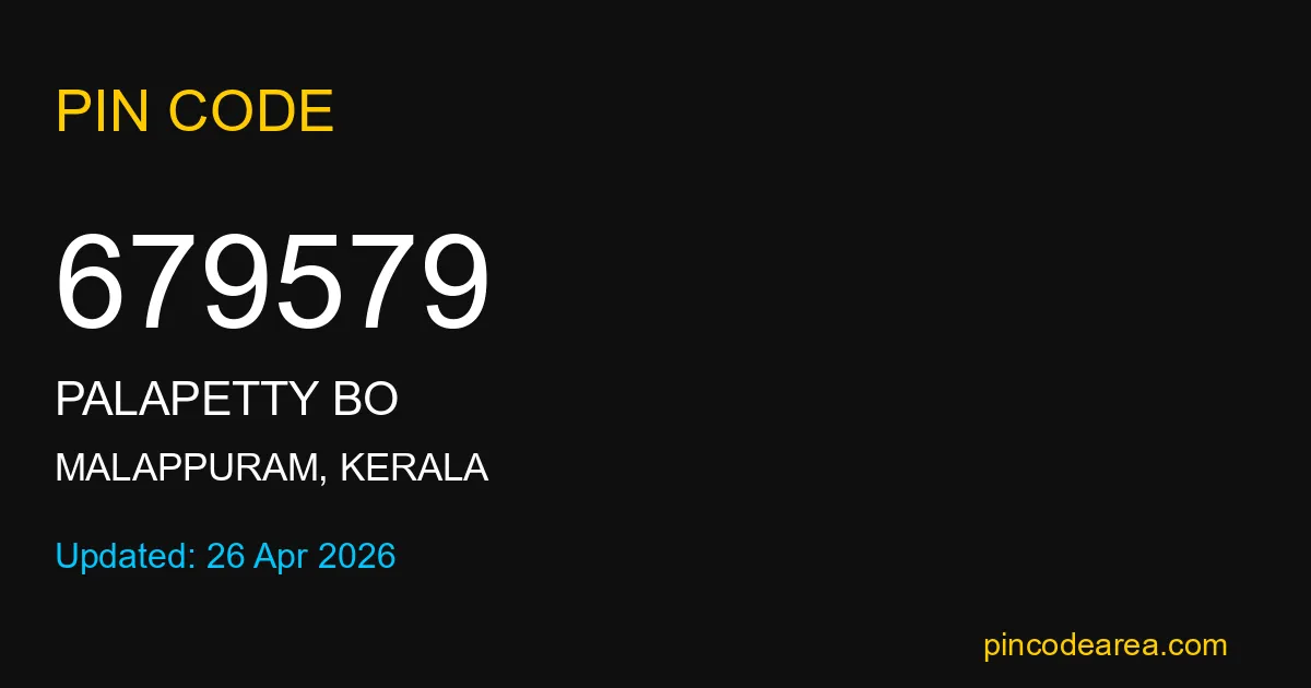 679579 PIN Code is assigned to Palapetty BO Post Office located in Malappuram district of Kerala. It helps in identifying the exact delivery area.