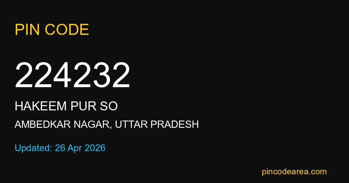 224232 PIN Code is assigned to Hakeem Pur SO Post Office located in Ambedkar Nagar district of Uttar Pradesh. It helps identify the exact delivery area for postal and courier services.