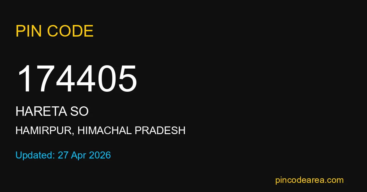 174405 PIN Code is assigned to Hareta SO Post Office located in Hamirpur district of Himachal Pradesh. It helps identify the exact delivery area for postal and courier services.