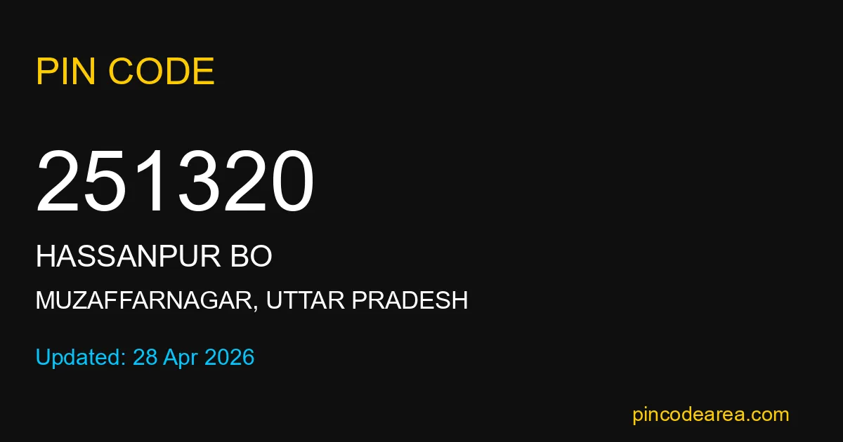 251320 PIN Code is assigned to Hassanpur BO Post Office located in Muzaffarnagar district of Uttar Pradesh. It helps identify the exact delivery area for postal and courier services.