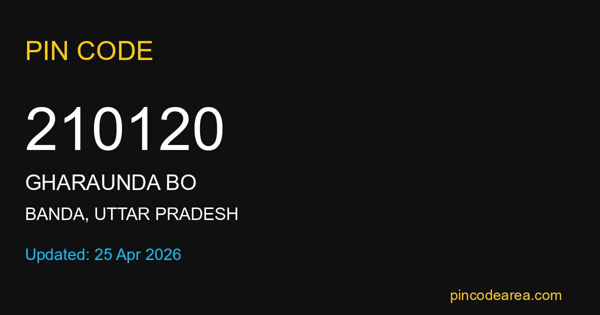 210120 PIN Code is assigned to Gharaunda BO Post Office located in Banda district of Uttar Pradesh. It helps in identifying the exact delivery area.