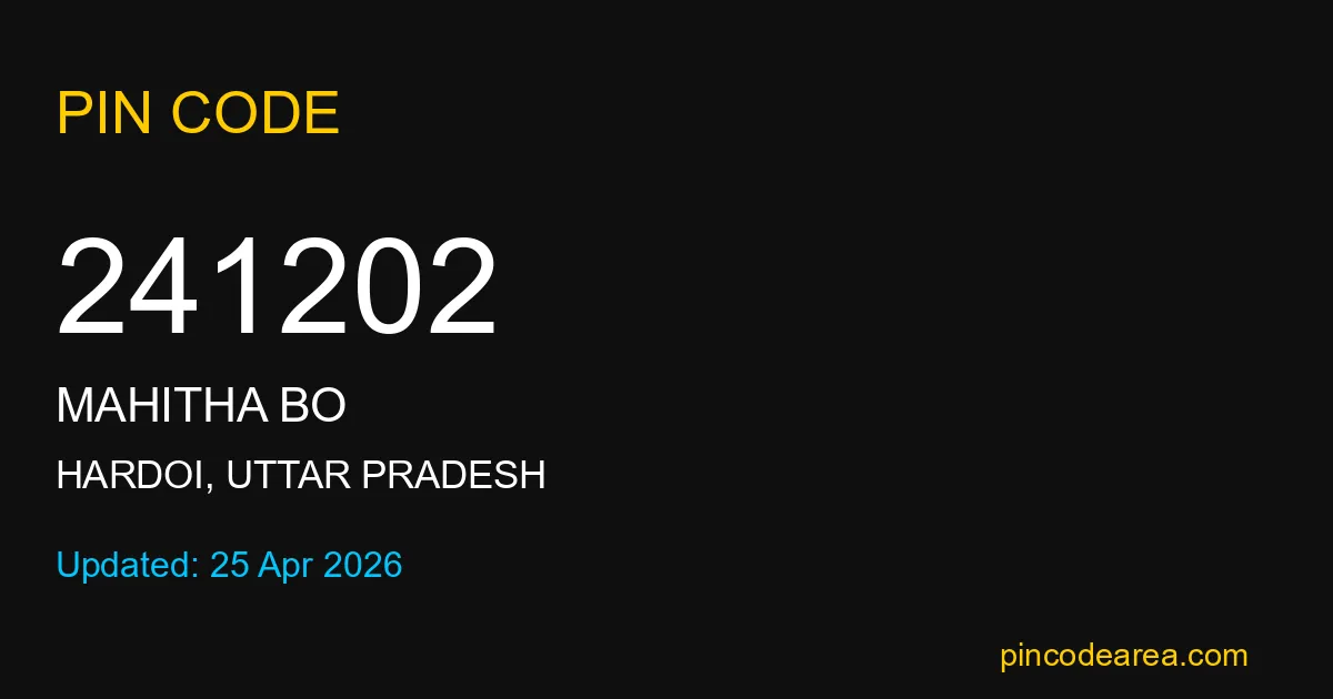 241202 PIN Code belongs to Mahitha BO Post Office in Hardoi district of Uttar Pradesh, India. This area mainly includes local residential and rural regions where India Post ensures timely mail and parcel delivery services.