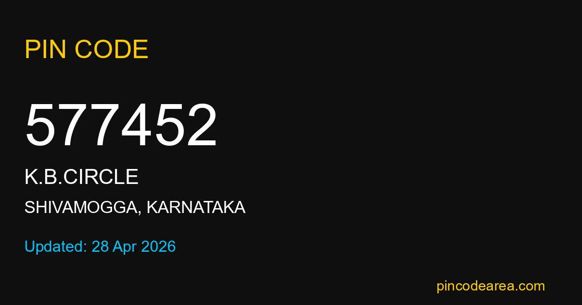 577452 PIN Code is assigned to K.B.Circle Post Office located in Shivamogga district of Karnataka. It helps identify the exact delivery area for postal and courier services.