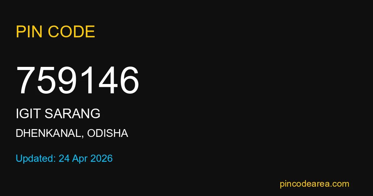 759146 PIN Code is assigned to Igit Sarang Post Office located in Dhenkanal district of Odisha. It helps in identifying the exact delivery area.
