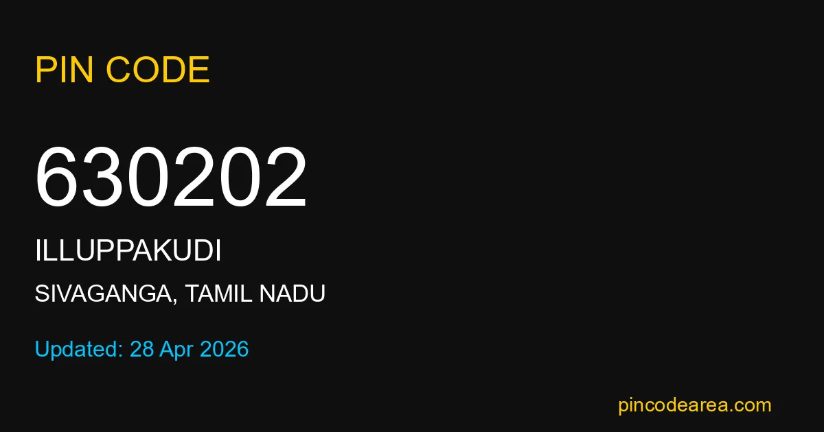 630202 PIN Code is assigned to Illuppakudi Post Office located in Sivaganga district of Tamil Nadu. It helps identify the exact delivery area for postal and courier services.