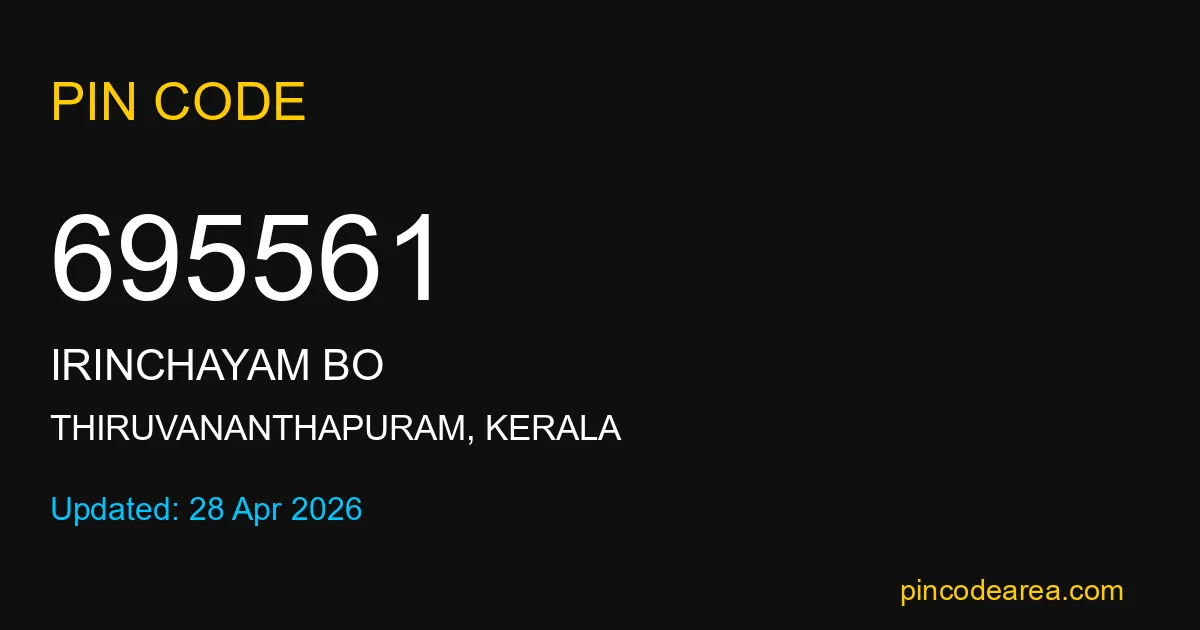 695561 PIN Code is assigned to Irinchayam BO Post Office located in Thiruvananthapuram district of Kerala. It helps identify the exact delivery area for postal and courier services.
