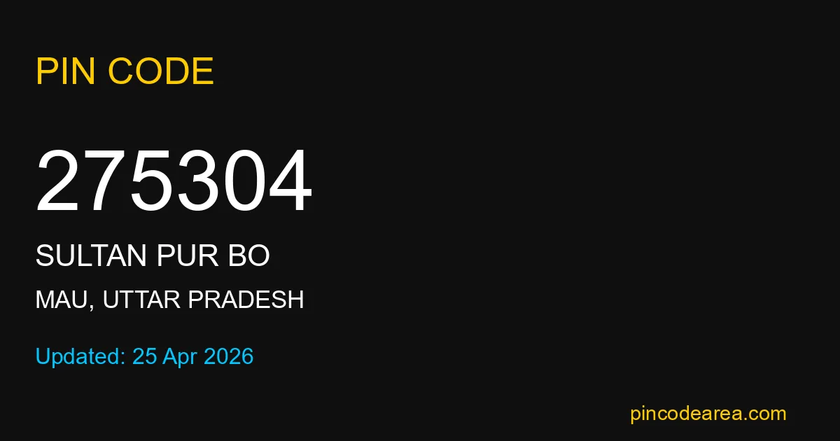 275304 PIN Code belongs to Sultan Pur BO Post Office in Mau district of Uttar Pradesh, India. This area mainly includes local residential and rural regions where India Post ensures timely mail and parcel delivery services.