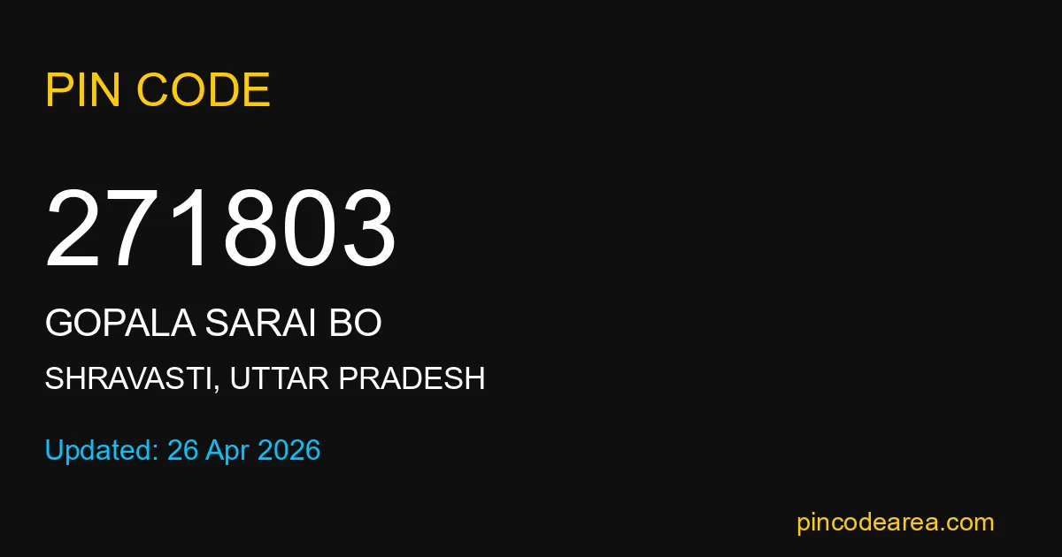271803 PIN Code is assigned to Gopala Sarai BO Post Office located in Shravasti district of Uttar Pradesh. It helps identify the exact delivery area for postal and courier services.
